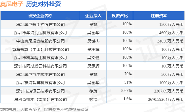 本站消息,根据天眼查APP显示,奥尼电子(301189.SZ)新增一起对外投资事件,被投资公司为深圳京海智算科技有限公司,法定代表人吴国华,投资占比为51%。该公司从事软件和信息技术服务业,注册资本为1000万人民币。目前长胜配资,奥尼电子共存在对外投资10项长胜配资,详见下表: