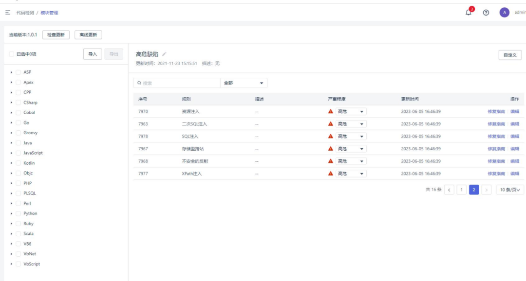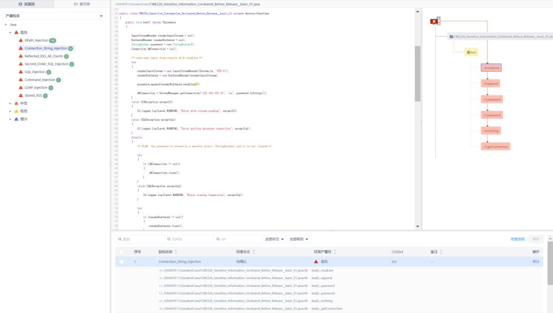 ●全面缺陷检测:覆盖缓冲区溢出、SQL注入、跨站脚本、危险函数、代码质量等2000余条检测规则,兼容国际主流安全标准。